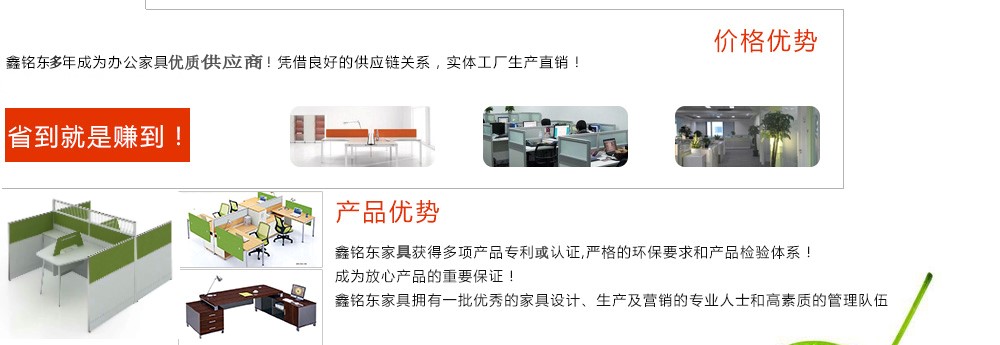 深圳市鑫銘東家具有限公司專業(yè)銷售各類辦公家具!產(chǎn)品涉及多種系列,如:班臺(tái)、班椅、屏風(fēng)、會(huì)議桌、會(huì)議椅、辦公沙發(fā)、茶幾、辦公桌、文件柜、電腦桌椅、各式餐臺(tái)、餐椅、書柜等辦公家具。 鑫銘東家具擁有一批優(yōu)秀的家具設(shè)計(jì)、生產(chǎn)及營(yíng)銷的專業(yè)人士和高素質(zhì)的管理隊(duì)伍。銘東家具以"先難后易"之戰(zhàn)略,在產(chǎn)品結(jié)構(gòu)、產(chǎn)品質(zhì)量及服務(wù)水平方面,均推陳出新,力求完善,精益求精。使我們的產(chǎn)品質(zhì)量保持在國(guó)內(nèi)外家具潮流的先進(jìn)水平,力求滿足客戶的特殊需求。鑫銘東家具多年來致力于環(huán)保、實(shí)用家具的設(shè)計(jì)與開發(fā),集生產(chǎn)、銷售、服務(wù)于一體。本著"以人為本"的設(shè)計(jì)理念,大量開發(fā)符合人體工程學(xué)的各種產(chǎn)品,以"誠(chéng)信為本"的質(zhì)量方針,真材實(shí)料,認(rèn)認(rèn)真真做產(chǎn)品,實(shí)實(shí)在在做人。鑫銘東家具更致力于創(chuàng)造"零維修率"的制造境界,實(shí)現(xiàn)"沒有維修的服務(wù)才是最好服務(wù)"的口號(hào)》了解更多